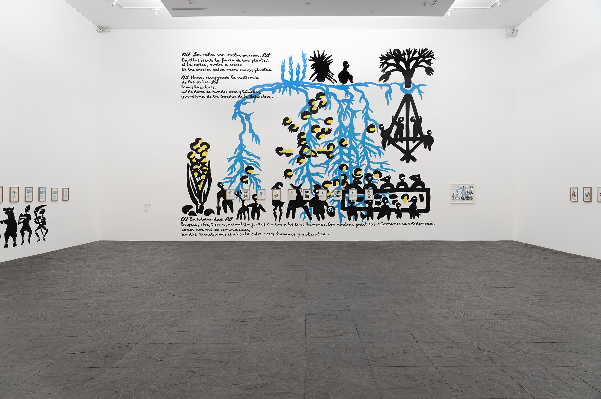 El ensayo visual Los derechos de un río y el diagrama El tiempo de los humanos en el Río Soča recuerdan el exitoso referéndum de 2021 para preservar la protección del agua en Eslovenia, cuando una abrumadora mayoría de votantes optó por revocar una ley que habría permitido a empresas privadas explotar los ríos del país con fines de lucro. En La vida del Río Lachlan y El tiempo del Río Lachlan se presenta su diálogo con un líder de la Primera Nación Wiradjuri en Australia sobre la defensa de uno de los ríos más particulares del mundo —pues desemboca en un lago y no en el mar— que se encontraba en riesgo por la construcción de una hidroeléctrica. Así mismo, en La lucha por la justicia social, obra realizada en Colombia en el marco de una residencia con el programa FLORA ars+natura, la artista presenta los cambios de paradigmas sociales y legales que implican los acuerdos, sean sociales o con la naturaleza. Este ensayo sirve como antecedente directo de La resiliencia de las raíces y La asamblea de los ríos, obras comisionadas para esta exposición, donde se celebra la gestión de organizaciones de base para el cuidado de las cuencas, los páramos y las ciénagas: son estos colectivos los que están pensando en el bienestar del mundo, los que tienen respuestas al cambio climático, los que traen esperanza.