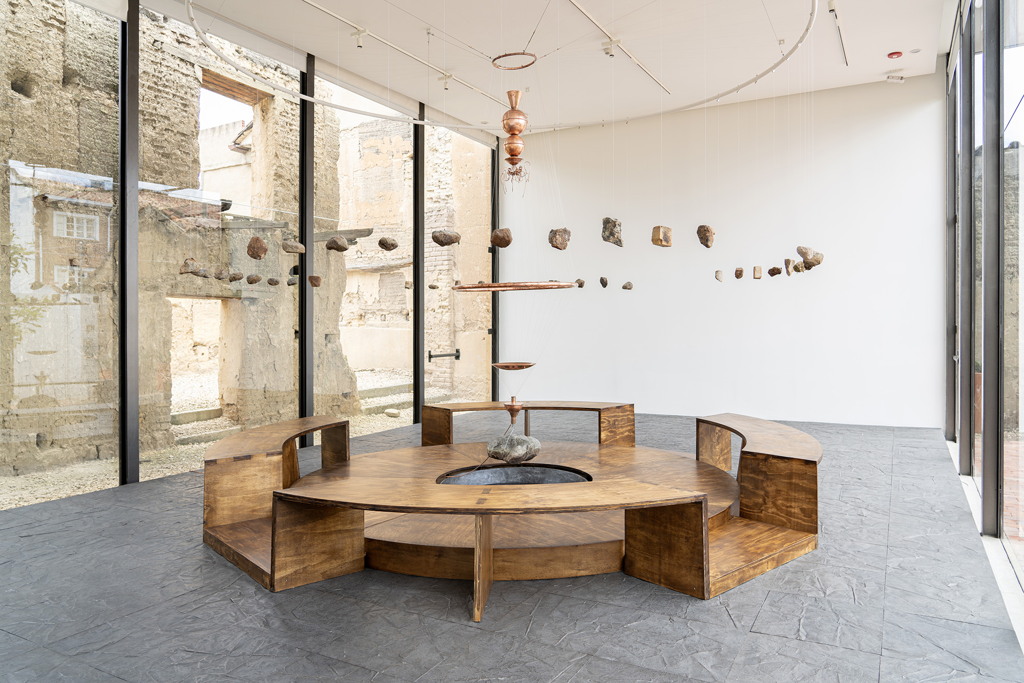 En su obra, Templo del agua - Sumapaz, Leonel Vásquez propone un espacio de escucha donde un instrumento interpretado por el agua, rodeado por un río celeste de piedras, desencadena un proceso sensible de ordenamiento de nuestras aguas internas. Para el artista, resonar en nuestro cuerpo líquido y sumergirnos en su naturaleza vibrátil nos permite ingresar en un estado de presencia, un continuum oscilante, donde nos reconocemos como seres con vida y nos permitimos tramitar lo emocional, lo sensible y lo intelectual por medio de acciones rituales y diálogos sagrados. Para Vásquez, escuchar el agua alivia nuestro cuerpo por dentro, cura nuestras palabras y, por proyección, sana el territorio. Este templo fue concebido como la sede de la asamblea de los seres vivos esperando que allí, entre cantos de agua y piedras que gravitan, se activen otras estructuras, otras voces, otras dimensiones temporales.